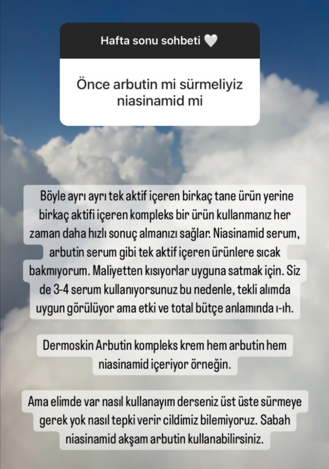 günlük sabah arbutin, yazın akşam svr-- kışın akşam peptit krem kullanıyorum...