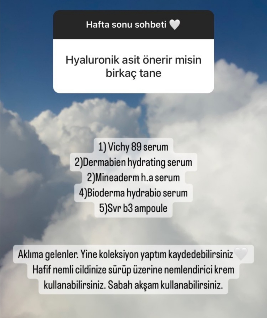 zaten beslenmem dengeli, kolajen ve vitamin takviyeleri alıyorum, güzel su içiyorum , spor yapıyorum , o yüzden cilde ekstra bir şeye ihtiyaç duymuyorum ,ürünlerin içeriği çok zengin ve serum - krem arası formda olduğundan tüm ihtiyaçlarımı karşılıyor .